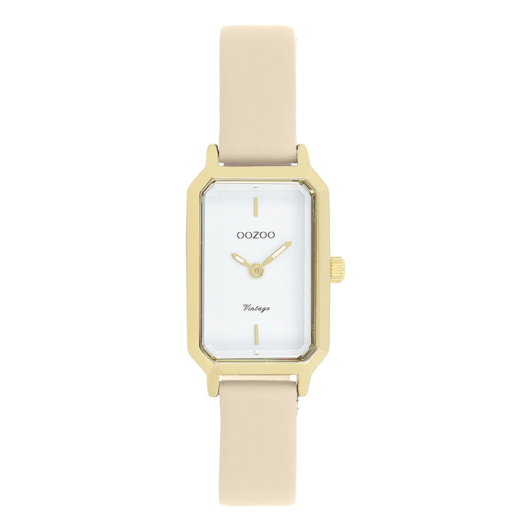 The classic look stays key in this trendy series and therefore, this rectangular OOZOO vintage design with a playful wink is the season must-have! This ladies watch is the perfect combination of fashion and comfort with its 22x19 mm gold coloured metal watch case and white circle pattern dial. The sand leather strap makes this watch a trendy accessory, which you can wear every day. The dial has gold coloured stripes digits and matching hands. The C20450 adds the sparkle to your outfit. The mineral glass lays in a 9,5 mm slim metal watch case with IP-plating. This design has a stainless steel backplate and is nickel safe. This watch has a 2ATM Japanese movement and is covered by a 2 year warranty (see section 3 of our Refund, shipping & warranty policy).