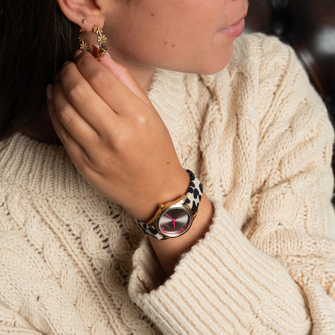 Stand out with this beautiful round ladies design from the trendy OOZOO Timepieces collection. The C11626 has a leopard print brown/black leather strap and 28 mm gold coloured metal watch case. You are making quite the fashion statement with this taupe sunray dial, gold coloured dots digits and fluo pink hands. This essential watch for your wardrobe has a mineral glass, stainless steel backplate and is nickel safe. This watch has a 2ATM Japanese movement and is covered by a 2 year warranty (see section 3 of our Refund, shipping & warranty policy).