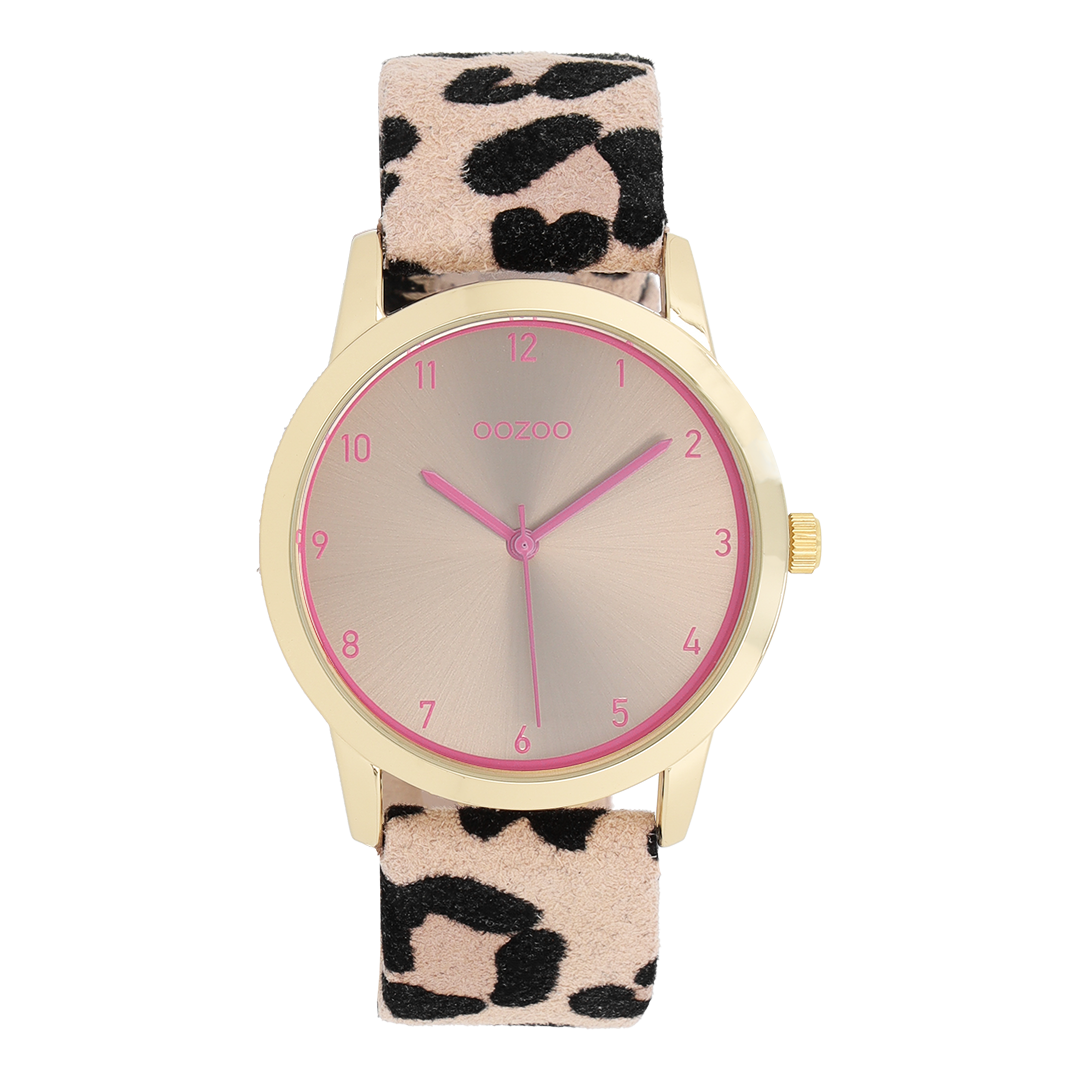 Stand out with this beautiful round ladies design from the trendy OOZOO Timepieces collection. The C11374 has a leopard print brown leather strap and 38 mm gold coloured metal watch case. You are making quite the fashion statement with this taupe sunray dial, fluo pink numbers digits and matching hands. This essential watch for your wardrobe has a mineral glass, stainless steel backplate and is nickel safe. This watch has a 2ATM Japanese movement and is covered by a 2 year warranty (see section 3 of our Refund, shipping & warranty policy).