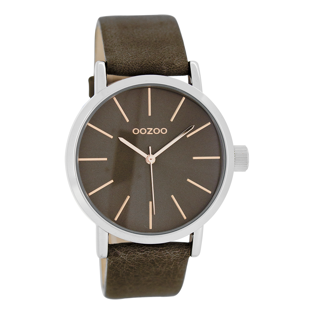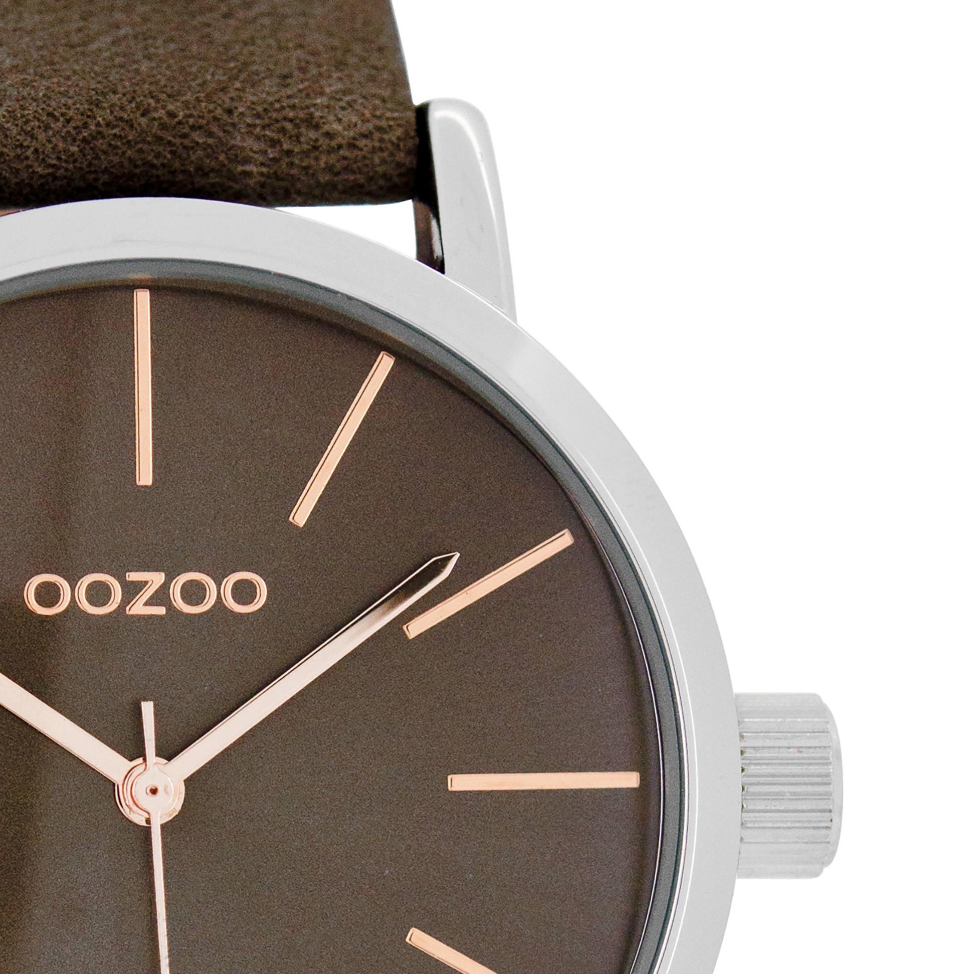 Silver coloured OOZOO watch with dark brown leather strap - C8423